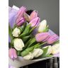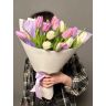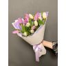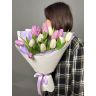 15 ярких тюльпанов розового и сиреневого оттенка аккуратно упакованы в дизайнерскую бумагу и перевязаны атласной лентой.