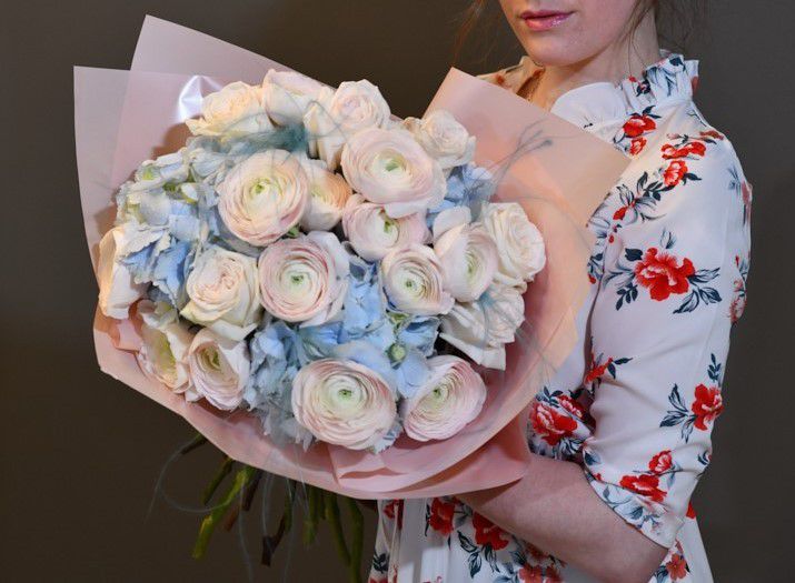 Гидрангия 3шт, ранункулюс 12шт, роза одноголовая 5шт