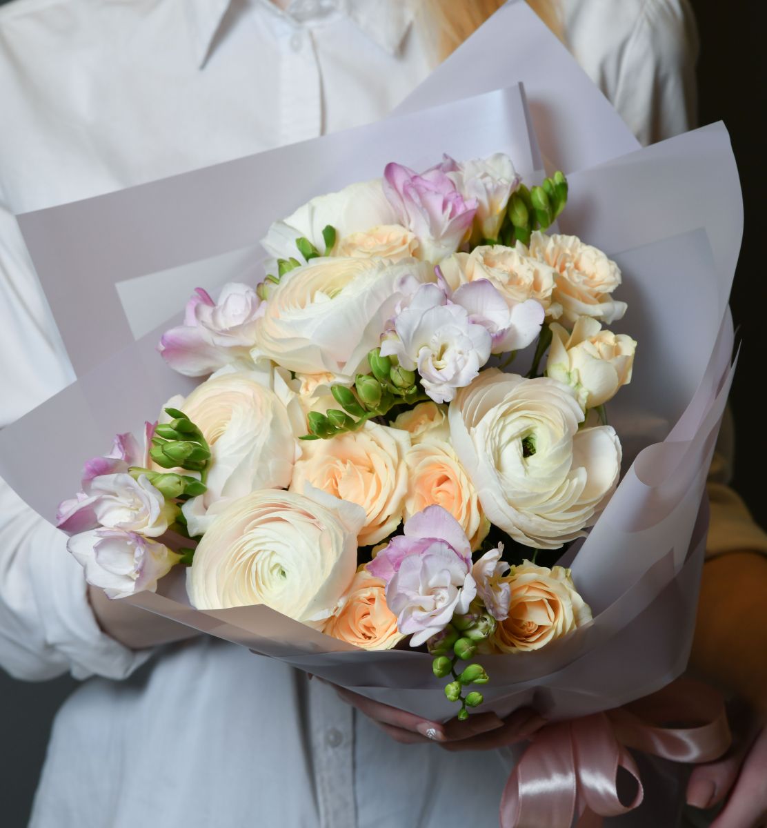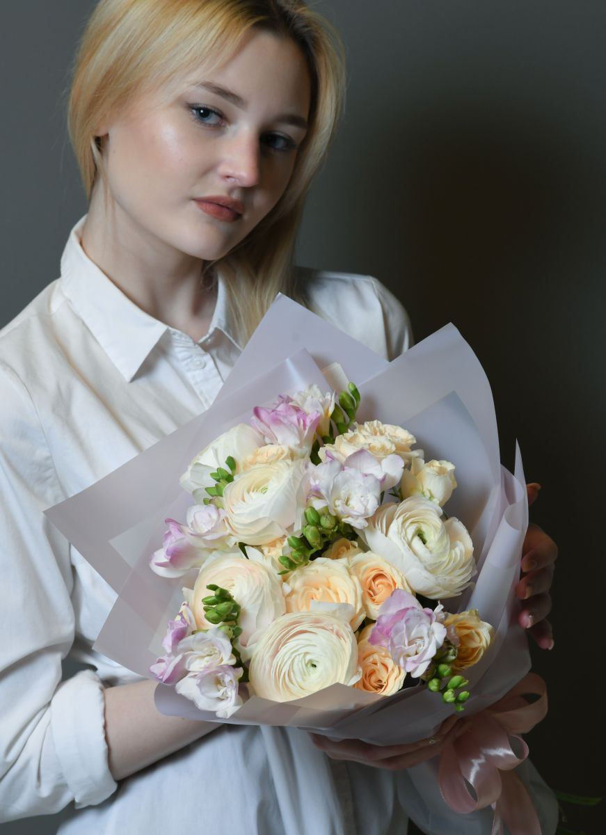 Роза кустовая 3шт, ранункулюс 5шт, фрезия 5шт,