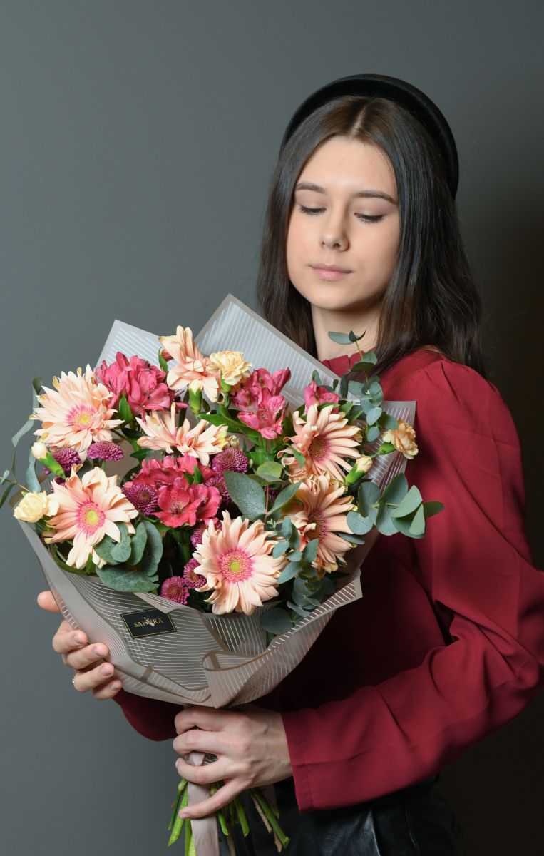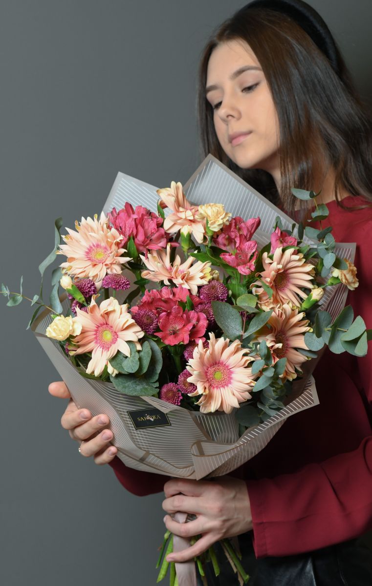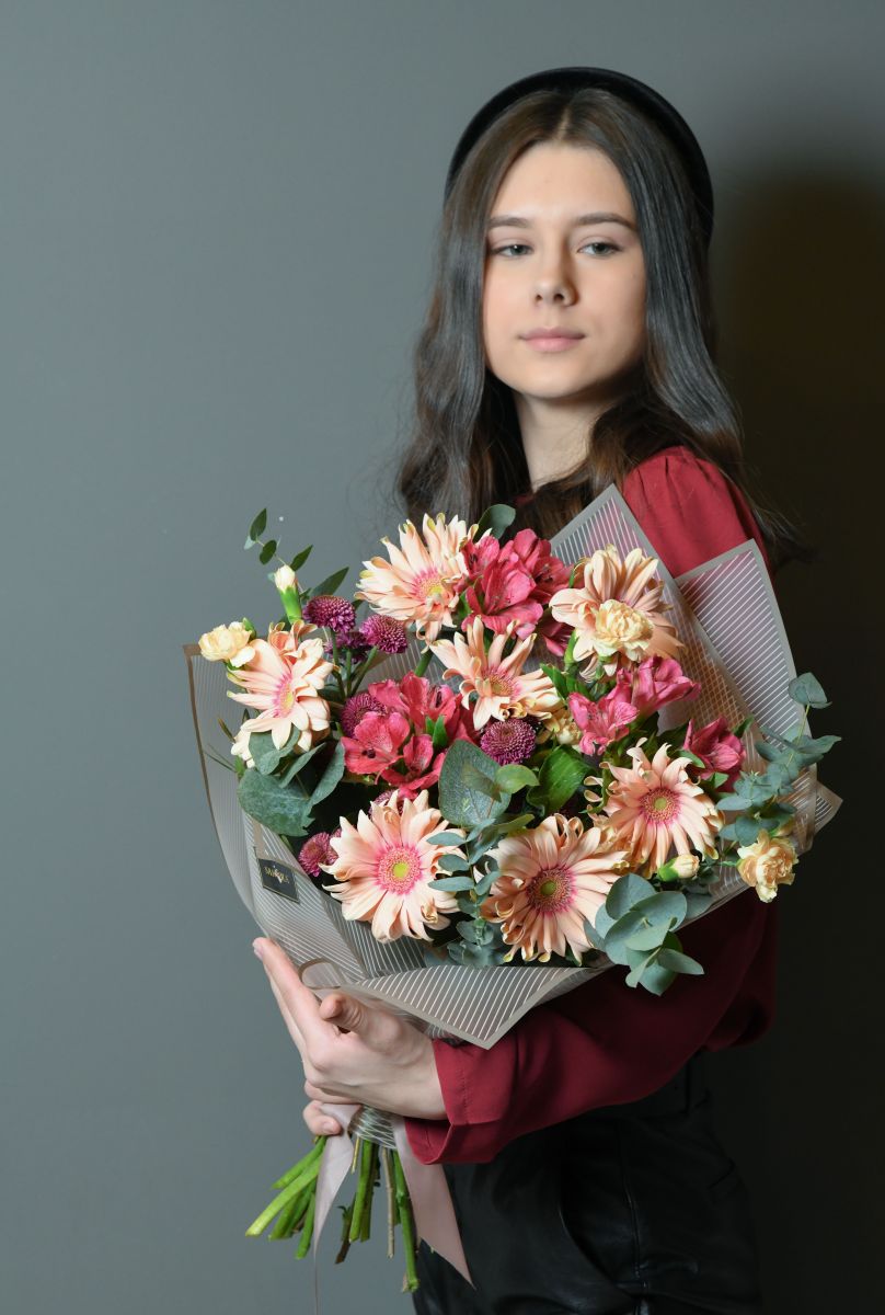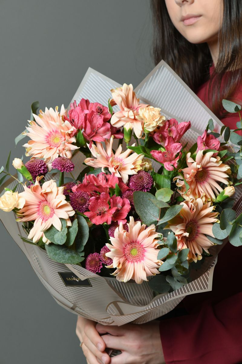 Гербера 7шт, хризантема сантини 4шт, альстромерия 3шт, гвоздика кустовая 3шт, эвкалипт, писташ